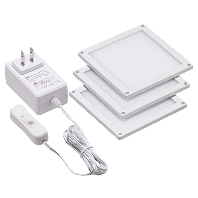 These Bazz LED panels are a great way to add overhead lighting to your home or office space. They have a surface-mounted design with a slim profile, which makes them easy-to-install, and they bestow an elegant, polished look to any area. Each energy-efficient LED panel provides 450 lumens of 3000 K white light. The 3-Watt panels measure 4 inches wide by 4 inches long. The set conveniently includes 3 light panels.
