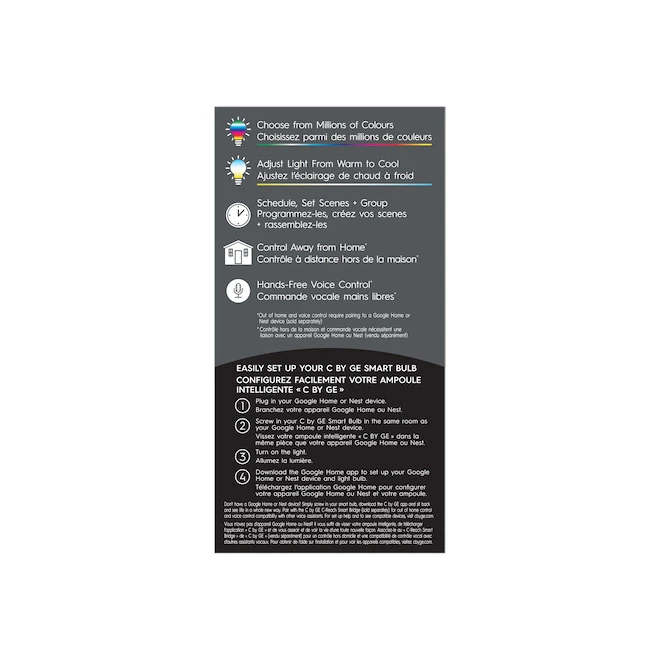 C by GE Full Color smart LED light bulbs help create the perfect mood or vibe in any room. Select from millions of colors, including tunable white light that’s synced with your body’s sleep/wake cycle. Set schedules and scenes, change color and dim from your smart phone. Full Color smart bulbs are Made for Google, so set up is simple and doesn’t require a hub or bridge when paired with a Google Home device. Twist. Pair. Speak. Then enjoy out of home and voice control through your Google Home device. Pair with the C-Reach smart bridge and Amazon Alexa for out of home and voice control using Alexa enabled devices. Replace traditional bulbs with the enhanced controls and vibrant colors of C by GE Full Color smart bulbs.