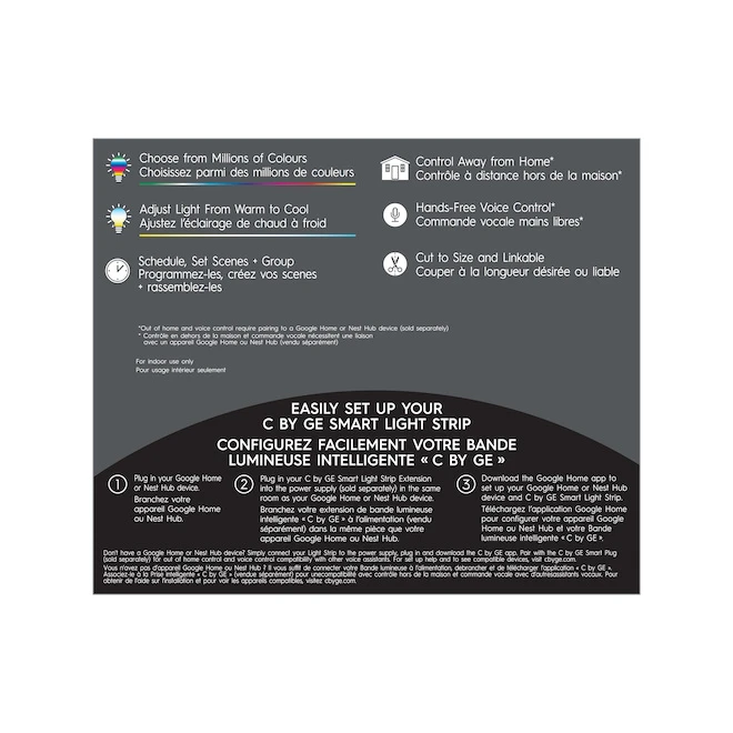 The C by GE Full Color smart LED light strip extension helps create the perfect mood or vibe in any room. Select from millions of colors, including tunable white light that’s synced with your body’s sleep/wake cycle. Set schedules and scenes, change color and dim from your smart phone. The Full Color smart light strip is Made for Google, so set up is simple and doesn’t require a hub or bridge when paired with a Google Home device. Plug in. Pair. Speak. Then enjoy out of home and voice control through your Google Home device. Pair with the C by GE smart plug, smart switch, or C-Reach smart bridge and Amazon Alexa or Apple HomeKit for out of home and voice control. Cut the light strip to size or link up to 32-feet to add an elegant glow around counters, cabinets, soffits and headboards. Power supply sold separately.