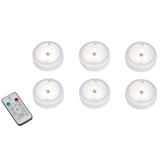 LED battery operated pucks with IR remote provide bright white task lighting perfect for kitchens and indoor work spaces. Use the included Command Strips by 3M for damage-free mounting or screw mount. Using the IR remote control the lights can be turned on/off, adjusts the brightness with dimming feature and set a timer setting. Dimming controls can be set at a custom setting or use the preset dimmer options (10%, 40%, 80% or 100%). The optional timer setting controls can be set to auto turn off at 1, 5, 15, or 30 minutes. Convenient tap on/off activation without the remote. 6-year limited warranty.