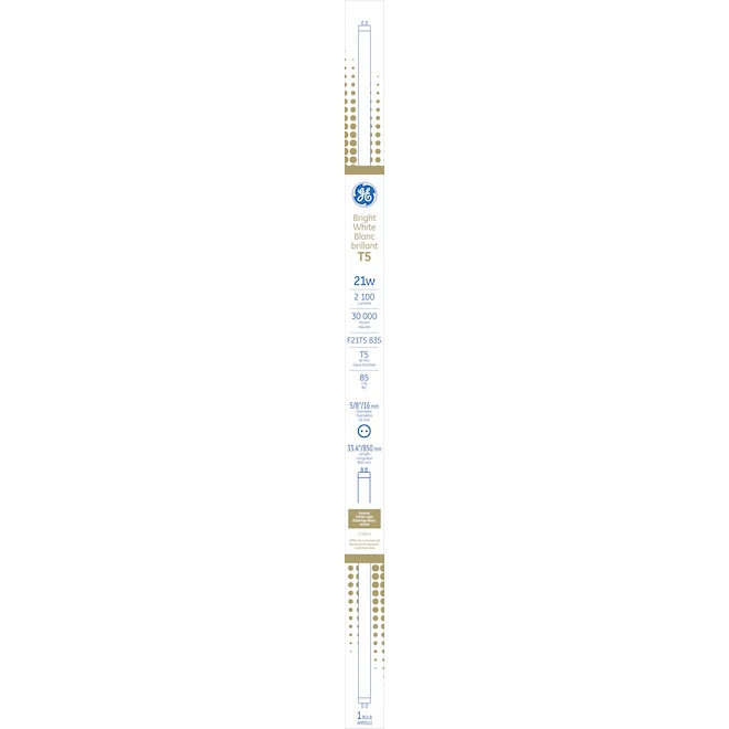 Our 21-Watt T5 Bright White fluorescent bulbs provide bright white light with a neutral colour tone. They provide neutral white multipurpose lighting for a variety of home and commercial spaces. These bulbs are rated to last 13 years based on 6 hour per day consumer use. Use these 33.4-inch long fluorescent bulbs with a 5/8-inch diameter in work spaces at home, offices and commercial buildings.