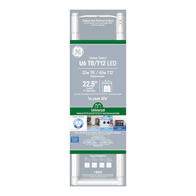 GE’s Color Select T8 LED U-Bend tubes replace U-Bend fluorescent bulbs using the existing fixture and electronic ballast. Why make the switch to LED? GE’s LED tubes provide long 16-year life based on six hours use per day, so you’ll replace less often. They use less energy than a 15-Watt T8 with nearly the same light output helping you save money on energy. And they’re mercury free. Use the toggle switch to choose between Cool White (4000K), Sunshine (5000K), and Daylight(6500K) to find the perfect colour temperature for any space.
