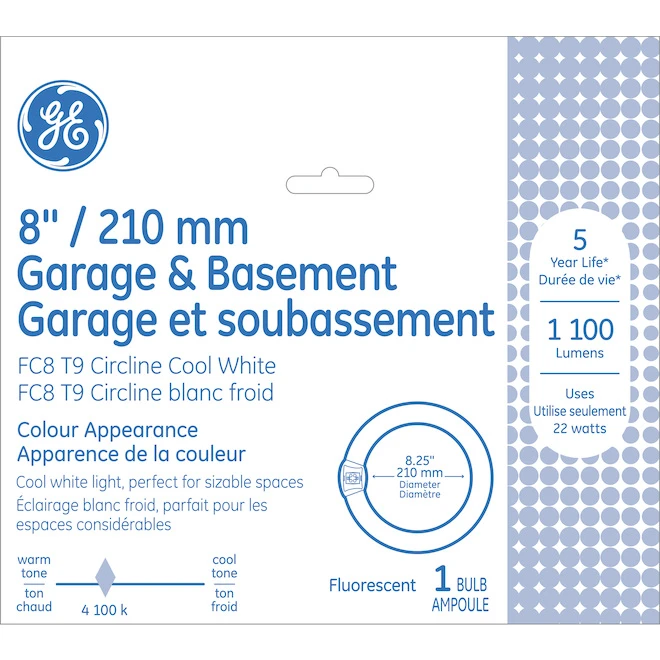 Our 8-inch diameter T9 Garage and Basement Cool White Circline Fluorescent bulbs provide cool, neutral white light. These bulbs are rated to last 5 years based on 6 hour per day consumer use. Use these 8-inch diameter circline fluorescent bulbs in basements, garages and commercial applications like warehouses and industrial buildings.