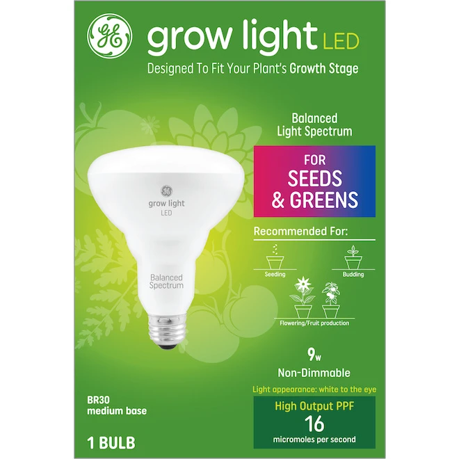- GE Grow light with balanced light spectrum for seeds and greens: The GE BR30 grow bulbs appears white to the eye but have a red/blue light spectrum that is perfect for tomatoes, cucumbers, peppers, leafy greens and herbs