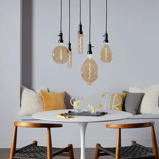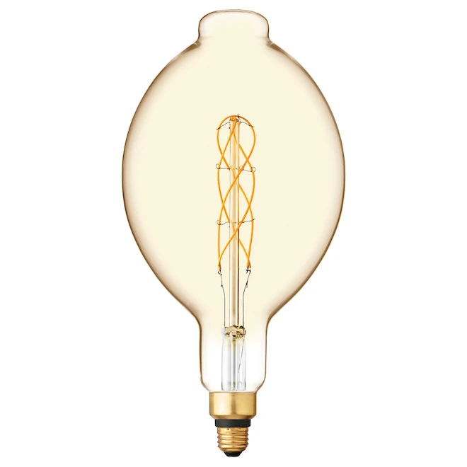 Large Vintage Style Spiral Weave Filament 40-Watt Replacement Amber Finish BT56 Decorative LED light bulb creates a dramatic focal point in any room. The sizeable glass globe and delicate weave filament beautifully accent traditional or modern fixtures. A warm candlelight glow and golden-tinted glass recreates the retro feel of Edison-style incandescent bulbs. This dimmable decorative bulb is rated to last 13 years based on 3 hours per day use. It features instant full brightness and is free of Mercury for easy disposal. Use the Large Vintage Style BT56 Decorative bulb with a medium base in dimmable pendant lights, table lamps and floor lamps. Remove the lamp shade and highlight the refined style of Large Vintage Style LED bulbs. Pair with our Pendant Fixtures for an enhanced look.