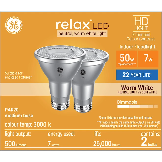 GE Lighting Medium Base 50W LED Bulb PAR20 Warm White, 2-Pack