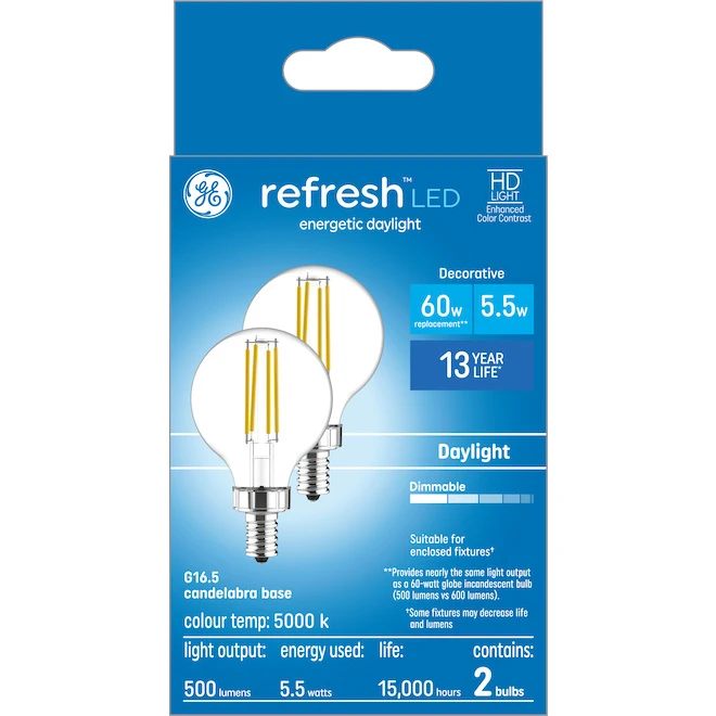 GE Refresh 60W EQ G16.5 Candelabra Base Light Bulb – 5000K – 2-Pack