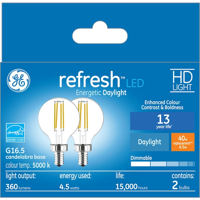 Be the first to review “GE Refresh HD Daylight 40W Replacement LED Decorative Clear Globe Candelabra Base G16.5 Light Bulbs (2-Pack)” Cancel reply