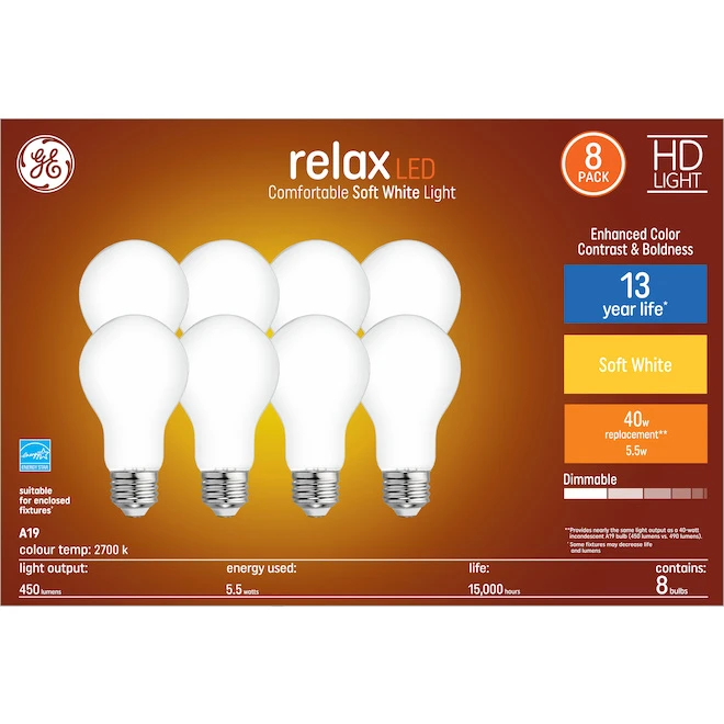 Relax HD Soft White LED 40-Watt Replacement light bulbs provide enhanced color contrast and boldness versus standard LED bulbs. The high definition soft white light helps create a comfortable, cozy light that’s ideal for bedroom lighting, foyer lighting, family rooms and dining rooms. They’re dimmable and illuminate your home with soft white light. These are great for frequently used fixturesuRelax HD Soft White LED bulbs are rated to last twice as long as Basic LED bulbs and save 56 dollars on energy costs over the bulb’s life versus a 40-Watt incandescent bulb. Unlike CFL bulbs, LED HD bulbs feature enhanced color, instant full brightness and are free of Mercury. Replace CFL and incandescent light bulbs with Relax HD Soft White LED general purpose light bulbs in indoor table lamps, sconces and open fixtures, including damp locations. Bulk LED light bulb 8 pack for residential and commercial use.