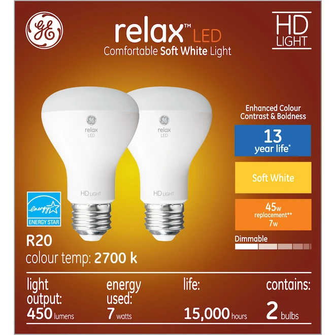 Relax HD Soft White LED 45-Watt Replacement R20 Indoor Floodlight bulbs provide enhanced color contrast and boldness versus standard LED bulbs. The high definition soft white light helps create a comfortable, cozy light that’s ideal for bedroom lighting, foyer lighting, family rooms and dining rooms. They’re dimmable and illuminate your home with soft white light. The floodlight design casts a wide beam of light. These are great for frequently used fixturesRelax HD Soft White LED bulbs are rated to last twice 13 years and save 62 dollars on energy costs over the bulb’s life versus a 45-Watt R20 incandescent bulb. Unlike CFL bulbs, LED HD bulbs feature enhanced color, instant full brightness and are free of Mercury. Replace CFL and incandescent light bulbs with Relax HD Soft White LED R20 (2-1 with 2-inch diameter) Indoor Floodlight bulbs in indoor track lighting and recessed lighting fixtures, including damp locations.