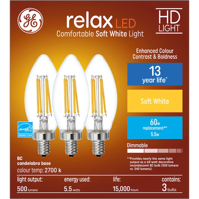 Relax HD Soft White LED 60-Watt Replacement Clear Finish Blunt Tip decorative light bulbs provide enhanced color contrast and boldness versus standard LED bulbs. The high definition soft white light helps create a comfortable, cozy light that’s ideal for bedroom lighting, foyer lighting, family rooms and dining rooms. They’re dimmable and illuminate your home with soft white light. These decorative bulbs are great for frequently used fixturesuRelax HD Soft White LED bulbs are rated to last twice as long as Basic LED bulbs and save 89 dollars on energy costs over the bulb’s life versus a 60-Watt decorative incandescent bulb. Unlike CFL bulbs, LED HD bulbs feature enhanced color, instant full brightness and are free of Mercury. Replace CFL and incandescent light bulbs with Relax HD Soft White LED Blunt Tip (BC) bulbs with a candelabra base in dimmable indoor chandeliers, sconces and fixtures where the bulb is visible, including damp locations.