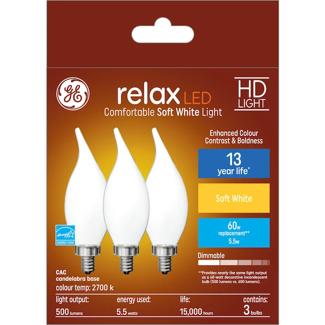 GE Relax HD Soft White 60W Replacement LED Decorative White Bent Tip Candelabra Base CAC Light Bulbs (3-Pack)