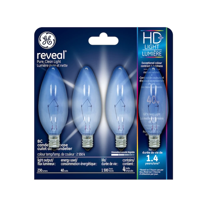 Reveal® bulbs illuminate a colour enhanced spectrum of light that brings out colours and helps patterns pop. Use blunt tip candle with candelabra base for use in chandeliers and sconces