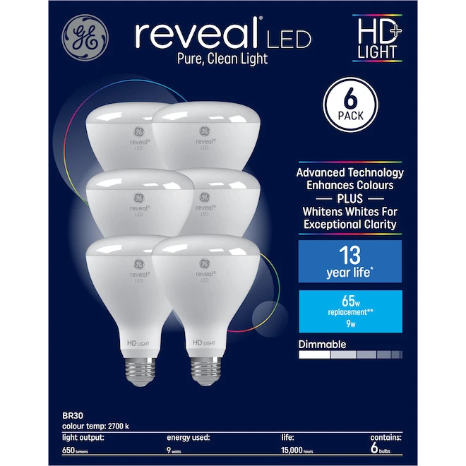 GE Reveal HD+ Colour-Enhancing 65W Replacement LED Indoor Floodlight BR30 Light Bulbs (6-Pack)