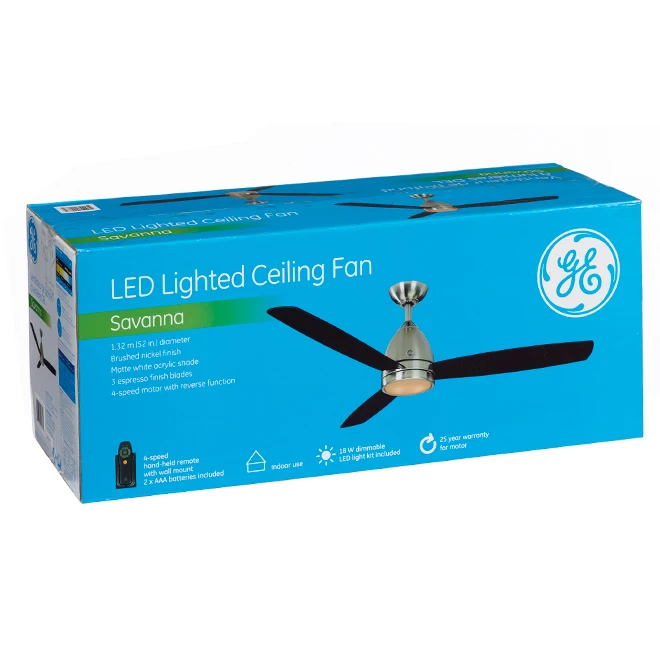 Keep your living space cool and comfortable with this 52-in GE Savanna ceiling fan. It integrates the SkyPlug mounting system to facilitate a safe and easy setup. This ceiling fan with LED light includes an 18-watt dimmable bulb for energy-efficient illumination. At the highest speed, it blows up to 5916 CFM of air to help regulate airflow in a 12 ft x 12 ft space.