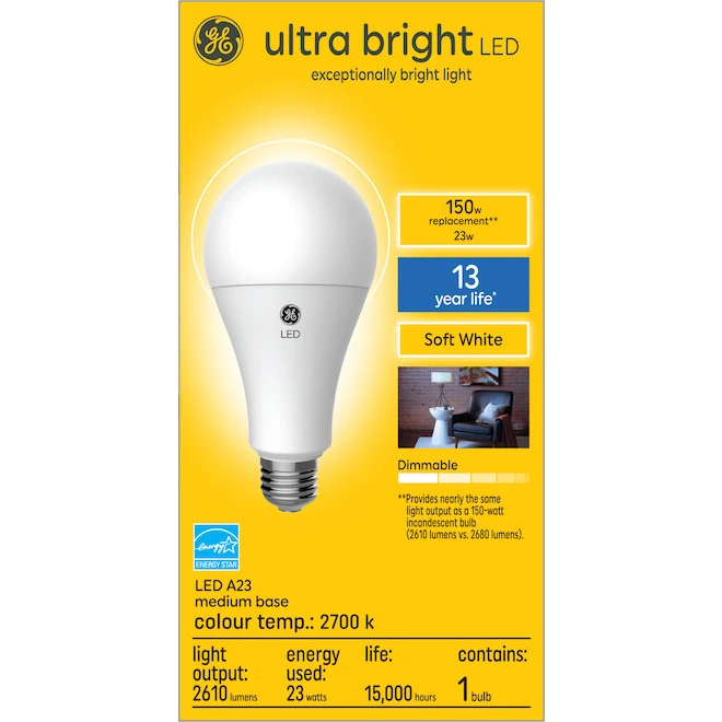 Ultra Bright Soft White LED 150-Watt Replacement A23 bulbs illuminate your home’s interior with Our very bright light. The beams of dimmable, soft white light brighten rooms to provide a sense of security when the sun goes down. This is great for frequently used fixturesuthis Ultra Bright Soft White LED bulb is rated to last 13 years based on 3 hours days. Unlike CFL bulbs, LED bulbs feature instant full brightness and are free of Mercury. Replace CFL, halogen and incandescent light bulbs with Ultra Bright Soft White LED that’s ideal for bedroom lighting, foyer lighting, family rooms and dining rooms.