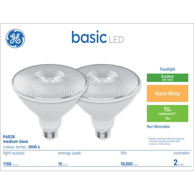 GE Basic Warm White LED PAR38 Outdoor Floodlight bulbs provide a long-lasting, energy-efficient alternative to incandescent and halogen light bulbs. They illuminate your home’s exterior and interior with warm white light. These are great for fixtures that are frequently left onuGE Basic Warm White LED bulbs are rated to last over six years and save 65 dollars in energy costs over the bulb’s life versus a 90-Watt halogen PAR38 outdoor floodlight bulb. Unlike CFL bulbs, GE LED bulbs feature instant full brightnessuincluding in cold temperaturesuand are free of Mercury. Replace CFL and halogen bulbs with GE Basic Warm White LED Floodlight bulbs in non-dimmable outdoor security lighting and indoor recessed fixtures to cast wide beams of light. They feature all-weather construction that’s rated for use in wet locations. Protect and beautify your home with GE Warm White LED PAR38 (4-3/4-inch diameter) Floodlight bulbs.