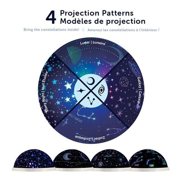- 4 INTERCHANGEABLE PATTERNS: the space projector comes with four interchangeable lenses (galactic, lunar, zodiac and starry night) so you can change the pattern whenever you want!