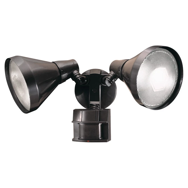 Get a clear view of the property around your home, garage, or shop using this security light with motion sensor by Globe. This dual-light fixture picks up movement within 70 ft., and it spans a 180-degree range from its location. The bronze finish offers an aesthetically pleasant and weather-resistant fixture. Mount on a wall outside, and adjust the angle of the two lights to direct illumination towards specific areas. This Globe security light uses a pair of 150 W maximum PAR38 type incandescent bulbs (available separately).