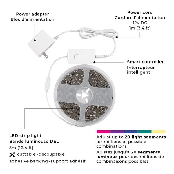 Automate your home with an app on your phone. It’s easy. Simply download the GLOBE SUITEâ„¢ App, sync your smart device and get your home automation started. With Globe Electric’s Smart LED Strip Light, you can have the perfect lighting ambiance for any situation. The 5-meter/16.4-foot connecting cord lets you use the strip light no matter where your wall socket is located while the self-adhesive backing allows you to place your light wherever you want. With 20 colour segments you can creatively customize your lights to shine with any colour combination imaginable. Use the music sync feature to turn your room into a fun party room or use it to help relax after a long day while listening to your favourite music. Hands-free, you can ask Google Assistant, Amazon Alexa, Smart Things, or Siri to turn them on or to change the colour to continuously have the ambiance you want. Creating dynamic lighting for your home has never been so smart.