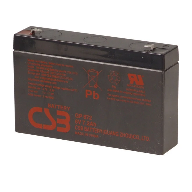 The GP672 is a general purpose battery up to 5 years in standby service or more than 260 cycles at 100% discharge in cycle service. As with all CSB batteries, it is rechargeable, highly efficient, leak proof and maintenance free. Internal resistance of approximately 12.3 m/.