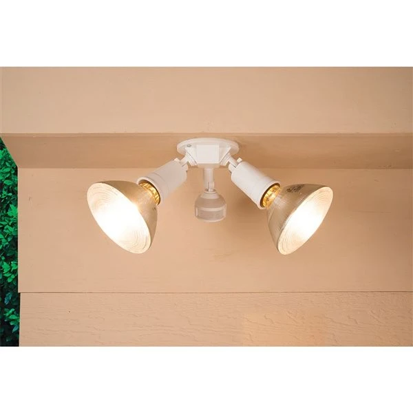 Halo All-Pro 110 degree Motion sensor, 300 watts PAR security floodlight. The fixture turns lights on automatically when motion is detected and off after a pre-selected time delay. It is made from durable plastic construction and is perfect for wall or eave-mount installation.