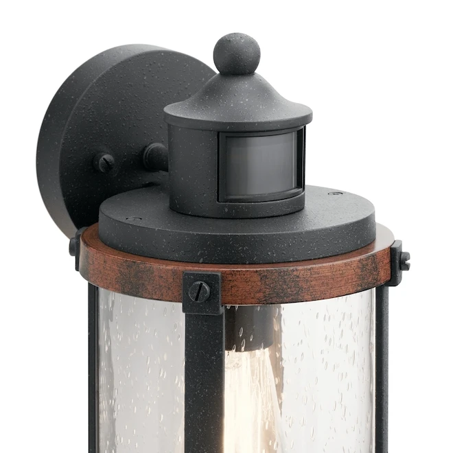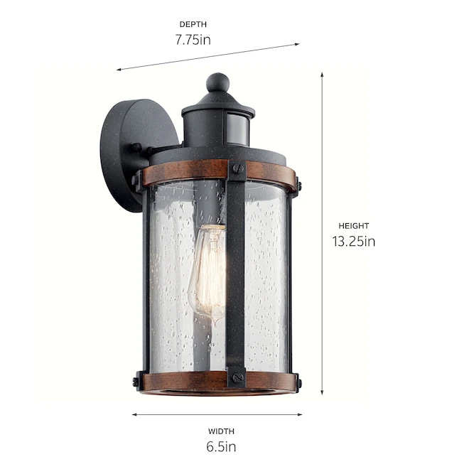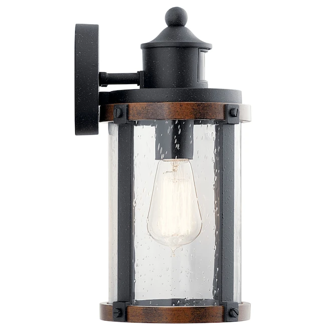 Distressed black and wood finish outdoor wall light is part of the Barrington collection Includes a classic seedy glass shade. Includes one 60-watt medium base vintage style starter bulb. Mounting hardware included to simplify installation. Coordinate with other Barrington collection fixtures for a cohesive lighting plan.