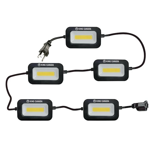 When you need the extra light while working in your garage, basement, work site or in your backyard, choose this 50-foot LED string work light. The 5 LED lights, at a distance of 10 feet each, provide 5000 lumens of light. It is linkable or it can be hardwired to a wall switch. Connect up to 10 string lights in a series, saving you installation cost and time.