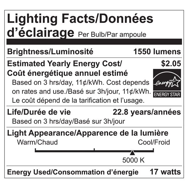 - LED 17W replaces 100W incandescent