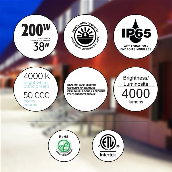 This LED yard light by Luminus is perfect for illuminating your outdoor space. It is suitable for both wall or poll mount installations and operates on a dusk to dawn schedule. It emits a bright cool white 4000 K colour and has an average life of 50,000 hours.