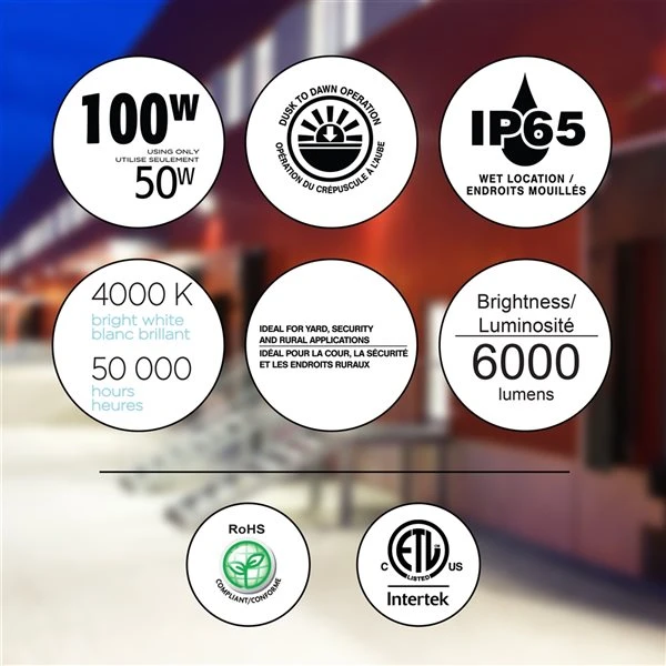 - 50 W, cool white 4000 K colour, 6000 lumens, 50,000 hours, dusk to dawn operation