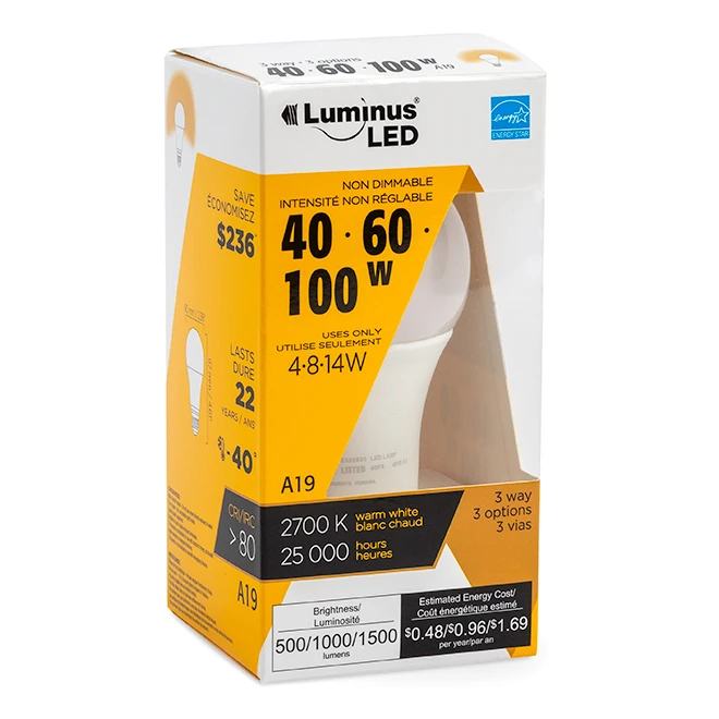 Brighten your home with energy-efficient light bulbs. This Luminus(R) 3-way LED light bulb provides a warm white brightness and replaces a traditional 40, 60 or 100 W bulb, depending on the selected intensity level. Finally, this bulb provides a maximum luminous flux of 1500 lumens, while its lifespan is approximately 25,000 hours. This Energy Star-certified bulb comes with a 3-year limited warranty.