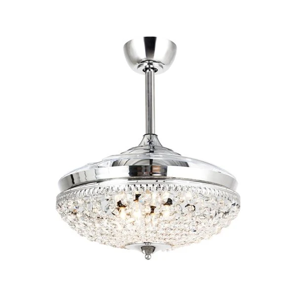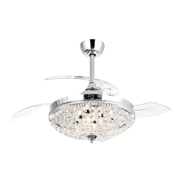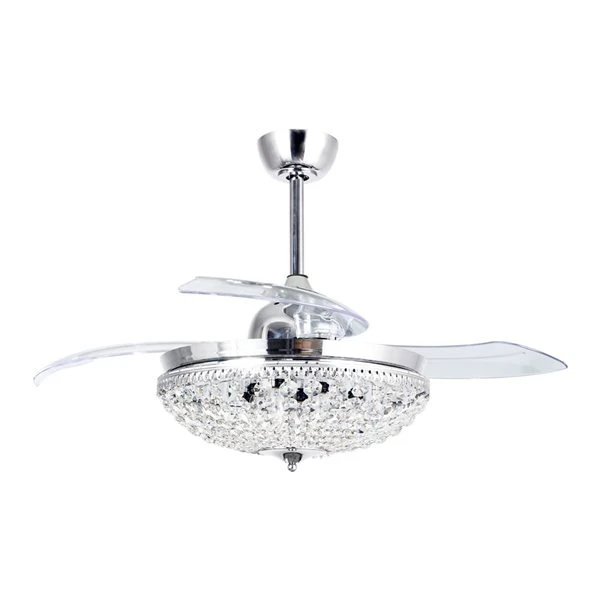 - Modern style: Modern chrome ceiling fan with crystal chains shade that includes three clear retractable blades.