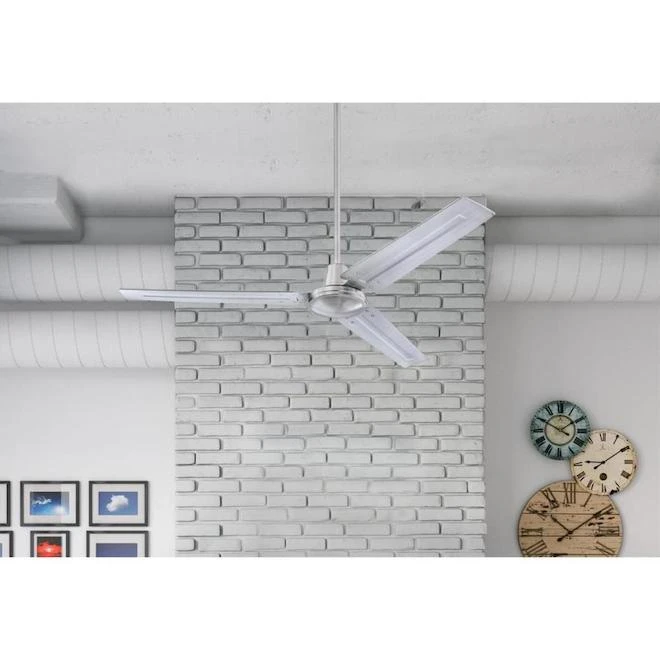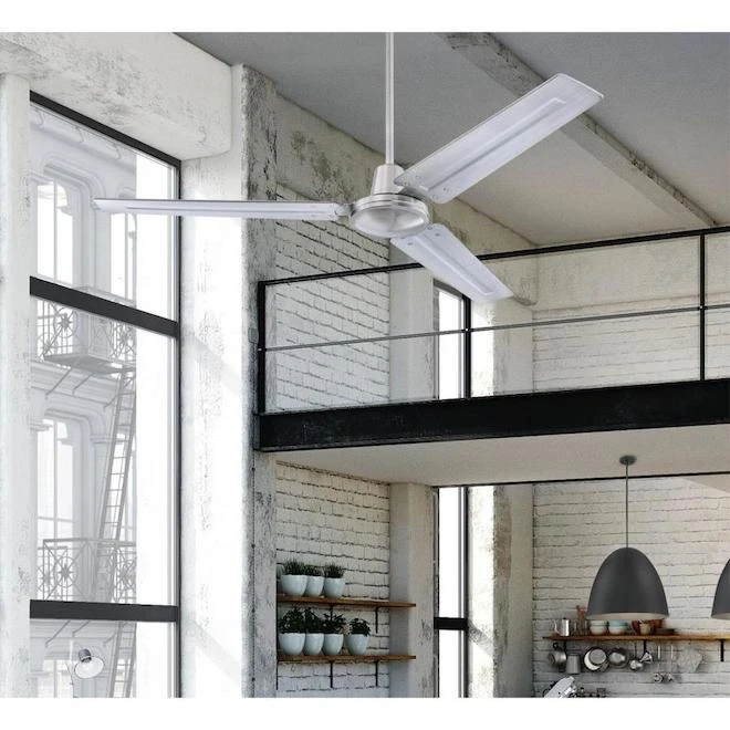 The modern-industrial style of the 56-inch ceiling fan is perfect for lofts and great rooms featuring a 12-inch-long down rod, ideal for higher ceilings. The brushed nickel ceiling fan blends seamlessly into contemporary spaces, enhancing the comfort of any room. The fan includes a handheld remote control, making it a breeze to operate all four speeds of the fan, for convenient customized comfort.