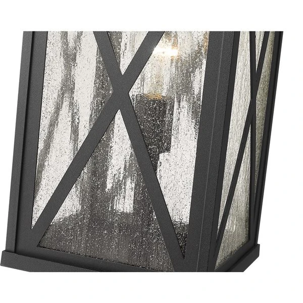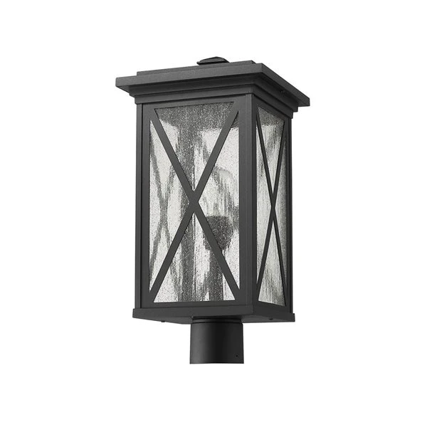 This one-light outdoor post mounted fixture comes in a box-shaped black aluminum cage with a clear seedy glass finish. It softly diffuses light to provide a welcoming glow to your front entrance or patio. Compelling X-accents bring dimension and character.