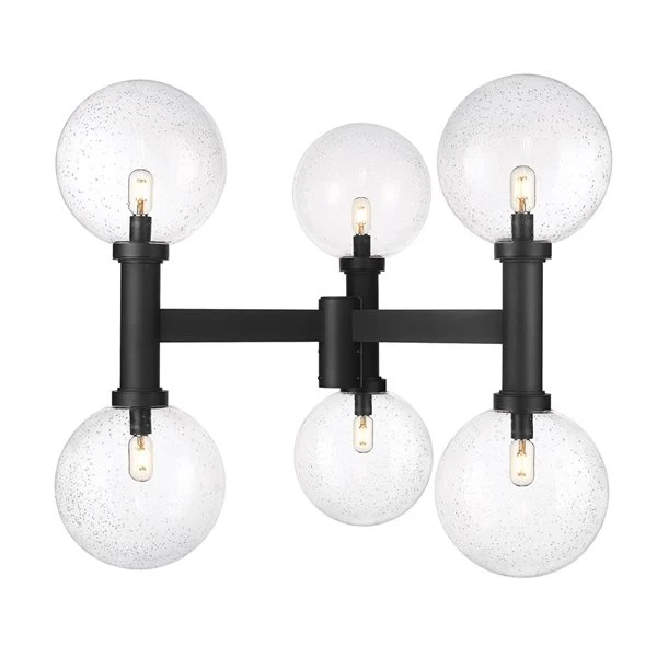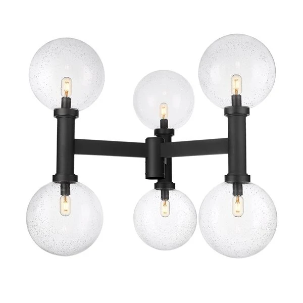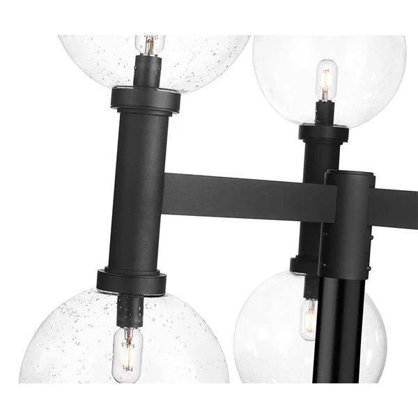 - With an abundance of illumination and a classic design, this exterior light fixture is a superb choice. A black finish aluminum frame makes a stunning venue to host six delicate clear seedy glass globe shades.